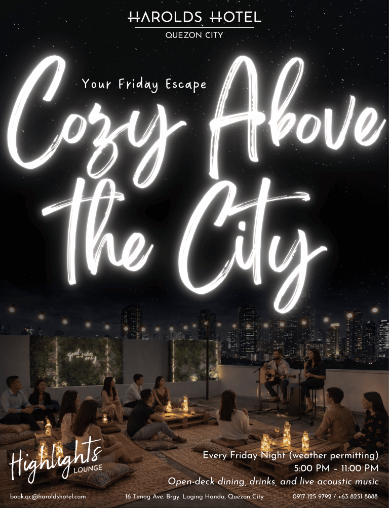 Unwind as the week winds down with open-deck dining, signature drinks, and live acoustic music under the city lights. Cozy Above the City is your laid-back Friday night escape—perfect for intimate gatherings, relaxed conversations, and slow evenings above the skyline.